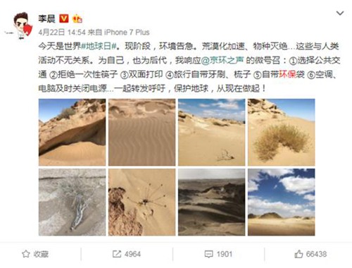 不仅如此,在世界地球日当天,李晨还积极响应@京环之声的微号召,呼吁公众保护地球,还在微博上PO出了环保宣言: