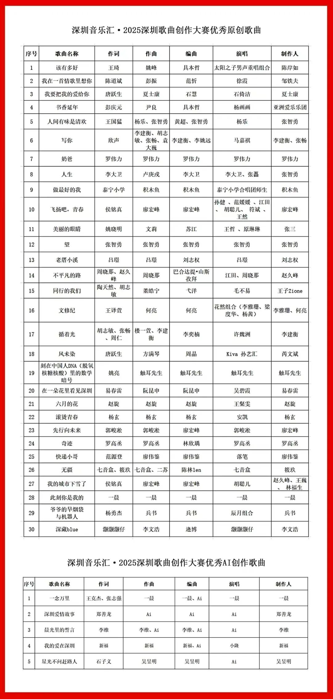 深圳音乐汇·2025深圳歌曲创作大赛榜单